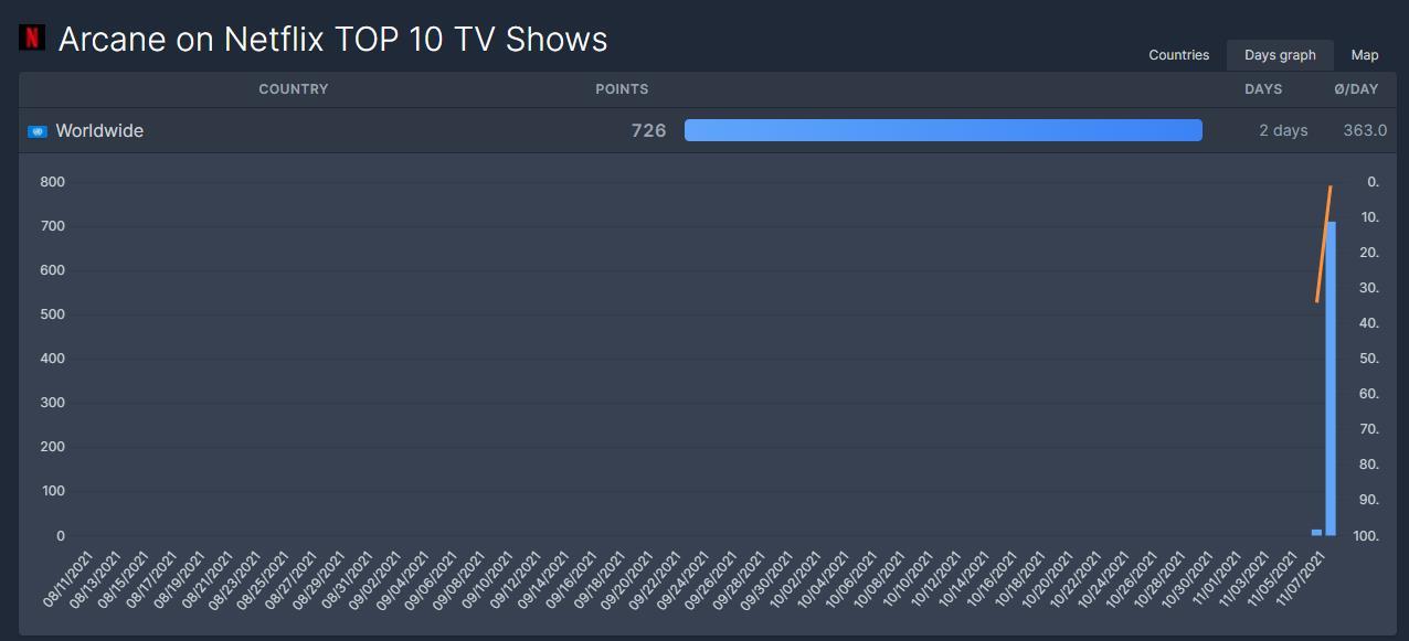 据统计网站FlixPatrol数据,《英雄联盟:双城之战》在11月8日播出前三集内容后,收视率瞬间飙升为Netflix全球收视率榜单第一名,打败了上个榜单第一名韩剧《鱿鱼游戏》,拳头公司这款改编动画已登上38个国家及地区的收视率前十。