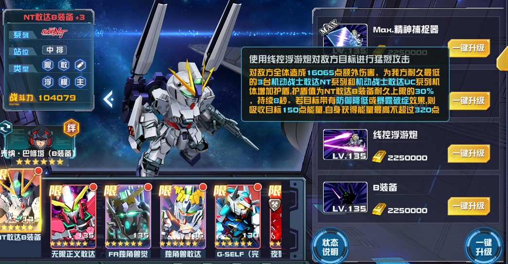 我方所有机动战士敢达NT系列和机动战士敢达UC系列机体增加23.5%耐久。