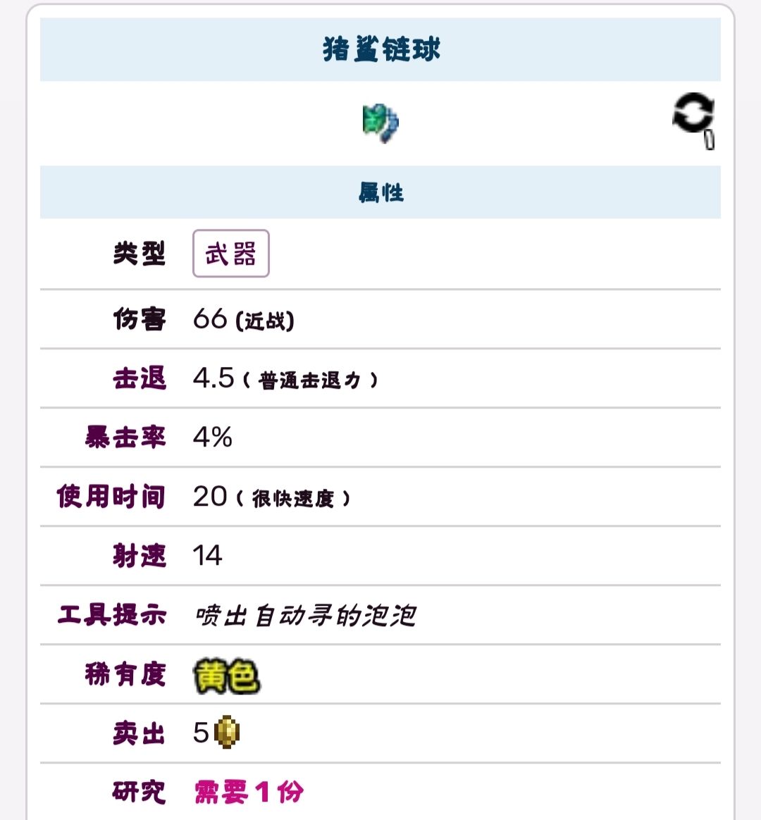 近战武器,链球属。链球射出后会喷出追踪的泡泡,输出很高,其攻击方式也与其他链球不同,这大大提升了他的手感。