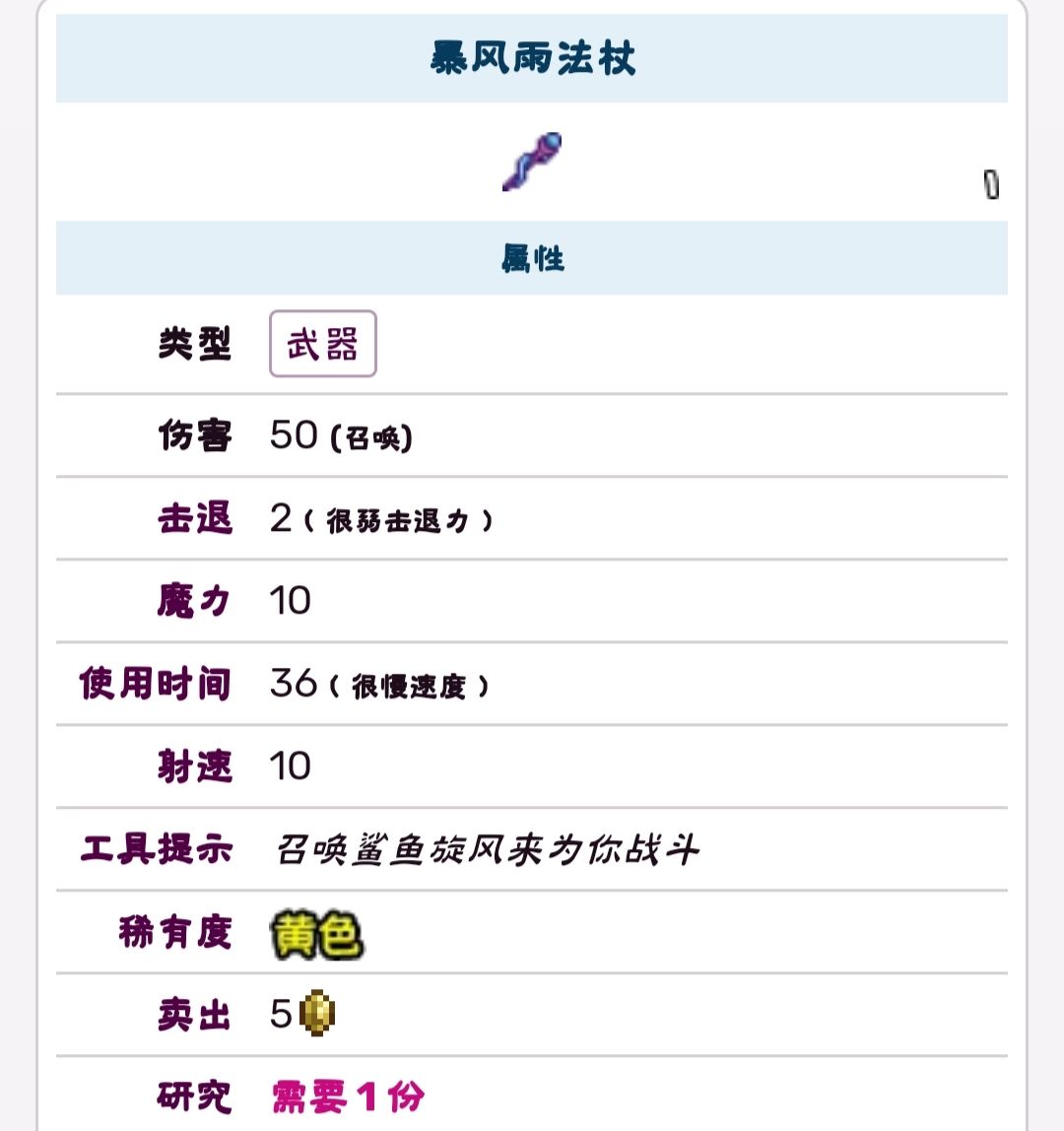 召唤武器,召唤杖属。召唤暴风雨并射出鲨鱼攻击敌人,射速慢,ai也不是很优秀。