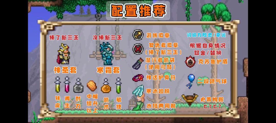 ★普通难度:水陆两用靴+游侠徽章+复仇者徽章+二段跳气球+寒冰翅膀+史莱姆鞍