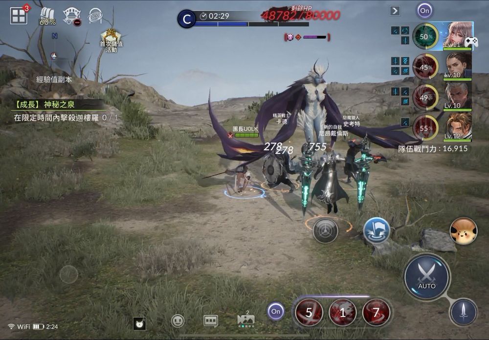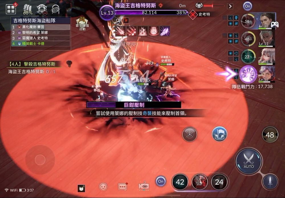 BOSS除了一般攻击之外还会使用准备时间较长的大范围强力攻击,这类型的攻击要是不躲开很容易会让队伍溃不成军,而自动战斗可不会聪明到去走位闪躲,这时就可以使用「集结」功能,一次操作4名角色走位闪躲攻击,不会出现玩家操作的角色已经闪得远远的,其他角色还傻傻在原地攻击的情况,相反地也可以藉由解除集结功能,操作防御型角色拉仇恨值,避免BOSS往其他角色的方向攻击,本作战斗系统的手动操作性很高,运用好的话跨战力打BOSS也不是问题。