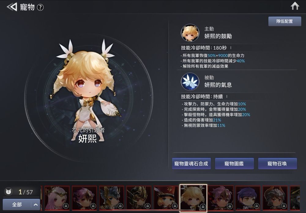 队伍中还可以让一只宠物上场支持,宠物有着不同的被动和主动技能,尽管剧情送的宠物主动技能的CD时间长达3分钟,还是在许多时候帮助笔者避免了团灭的危机,要是成功入手希有宠物想必更能大幅提升队伍战力。