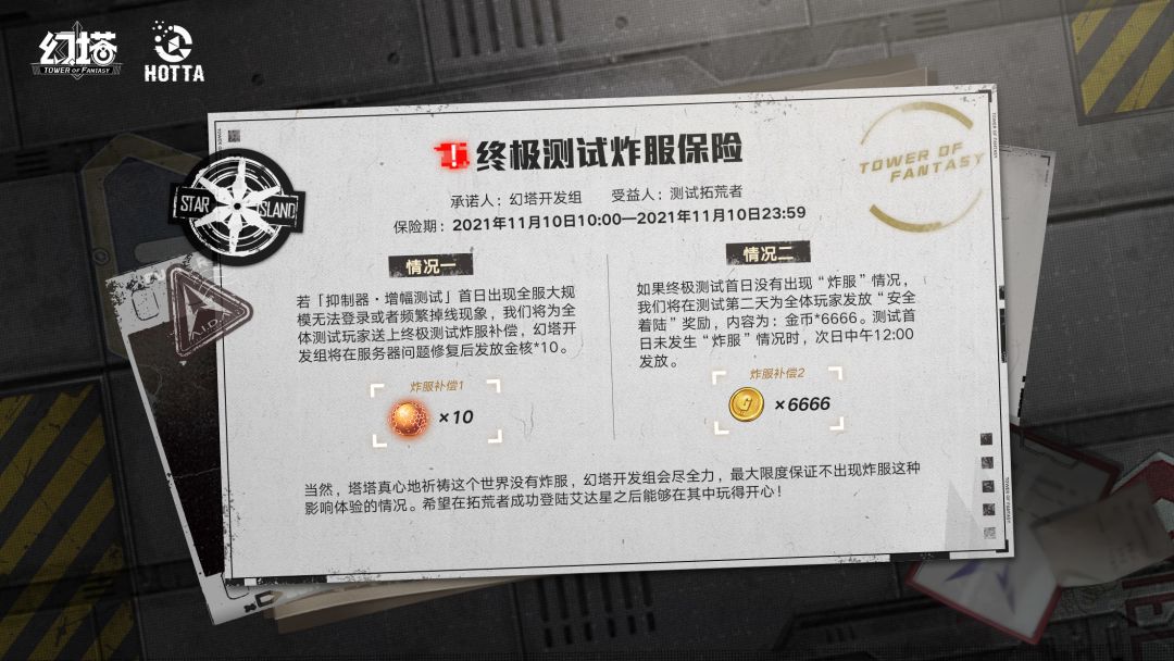 再三思索,为了降低“炸服”情况对拓荒者造成的恶劣影响,现申请与拓荒者签订终极测试炸服保险,即刻生效。