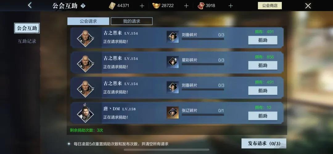 除了能够进行捐献壮大公会,在公会活动中,还有公会互助玩法,在这里可以捐助其他成员武将碎片,也可以发布求助请求,霸哥就经常在心仪的武将碎片收集到49个时,收到来自同公会成员的捐助,那简直是雪中送炭了,捐献和互助玩法可谓是诠释了公会集结群英,协力发展的真谛。