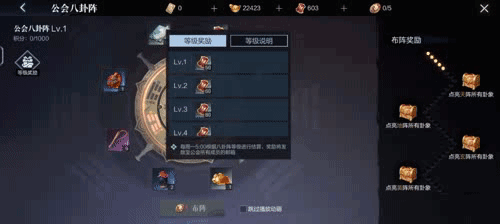 另外,公会八卦阵的点亮进度同样也会给到额外的奖励,一般是不同品级的绝学,以及八卦阵的经验奖励。没错,八卦阵是可以升级的 ,并且它的等级是所有公会成员共享的。当它升级后,所有公会成员都可以在每周一5:00,八卦阵结算时,将为所有成员发放对应等级的贡献币奖励。