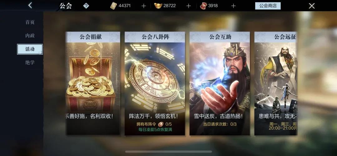 在公会远征中需要公会成员们共同挑战强力的武将首领,通关后所有成员都可以获得大量贡献币和绝学奖励。