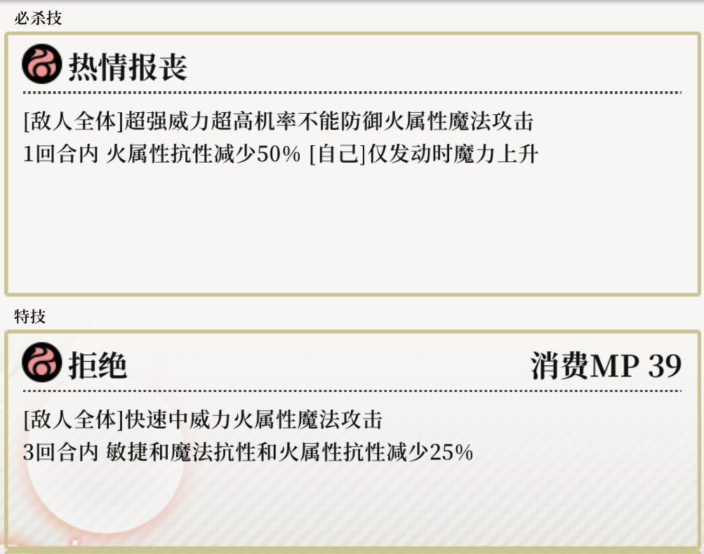 技能1:【拒绝】快速中威力火属性魔法攻击,附带弱化敌人敏捷、魔法抗性和火属性25%(3回合)适用于各类场合。