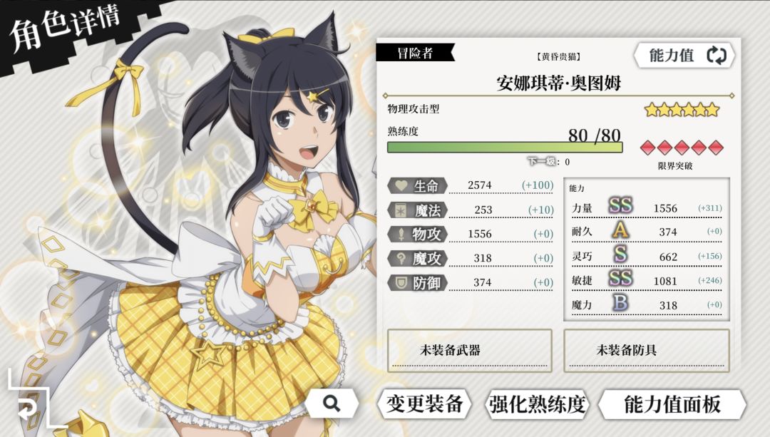 技能2:【剑之圆舞曲】超威力超高贯穿率的全体光属性物理攻击,虽然是有提升力量和光属性伤害4回合的暖机技能,但也是黄昏贵猫对群体敌人最高伤害的技能了。