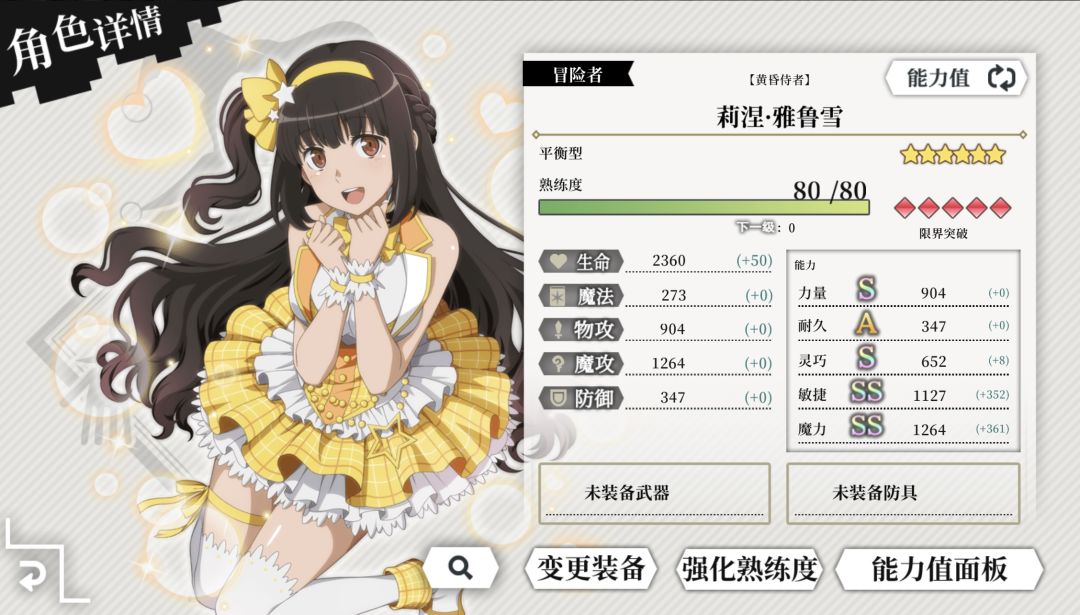 物理攻击型冒险者。技能1:【壮观景象】速攻高机率无法反击的全体光属性物理攻击技能。附加的弱化包含了全体和单体受到的伤害值20%(4回合),虽然全体的部分并不是最高弱化,但无论是荣光还是派发歼灭战都十分依赖反击的伤害,因此该技能无论是单用还是自杀撤退都相当有价值。