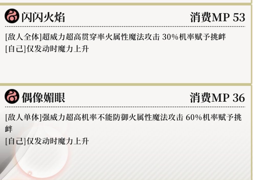 技能3:【偶像媚眼】强威力附加高机率不可防御的单体火属性魔法攻击,附带60%挑衅。