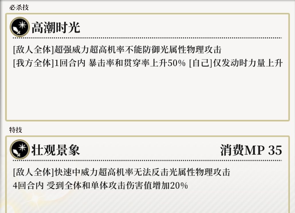 必杀技【高潮时光】可对敌人全体造成超强威力超高几率不能防御光属性物理攻击。附加暴击率、贯穿率上升50%,发动时力量上升。