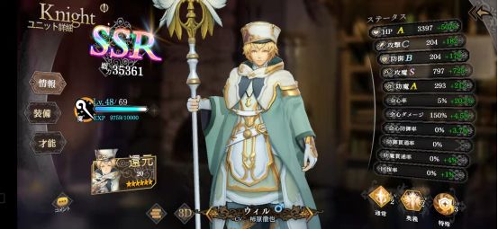 3 维尔,可以看到日服女主的强势所以我的维尔练度基本为0,30连的SR卡中建议带一张维尔,优势是奶量比女主足,为主输出手增伤25%也比女主强,大招升至3级还能为生命最少的队友上免死BUFF,缺点是女主大招能清所有队员的DEBUFF,维尔只能清单体,所以试炼BOSS开荒的时候可能需要双奶同时上场,推图可以选维尔。