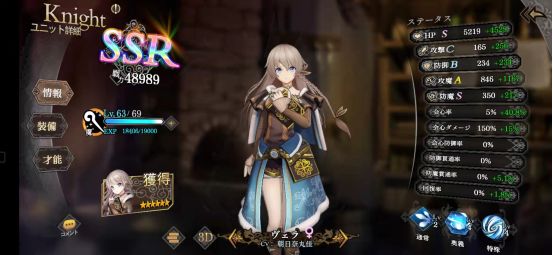 4. 维拉 登录7天就会送的SSR,在日服及台服的T0辅助,到了国服变成了普通奶妈,只能说被狠狠砍了一刀,原本有维拉在主C能每回合双大,现如今只能对普攻行输出手进行再动,且每回合再动条件变得苛刻,前期若你有练羞耻弓并作为主C,可以建议将维拉的技能点一下,若没有还请你将她仓管,送的SSR去仓管也没啥好抱怨的。