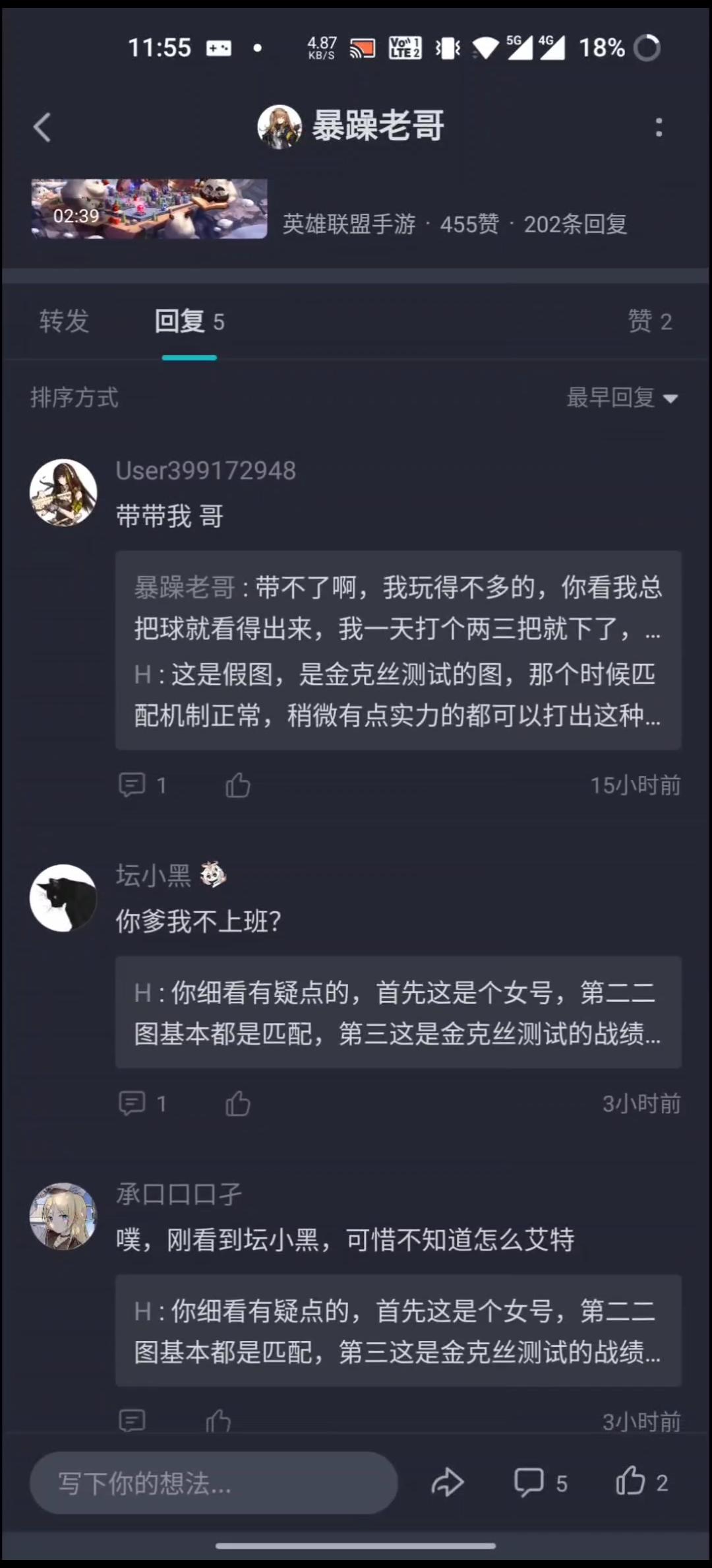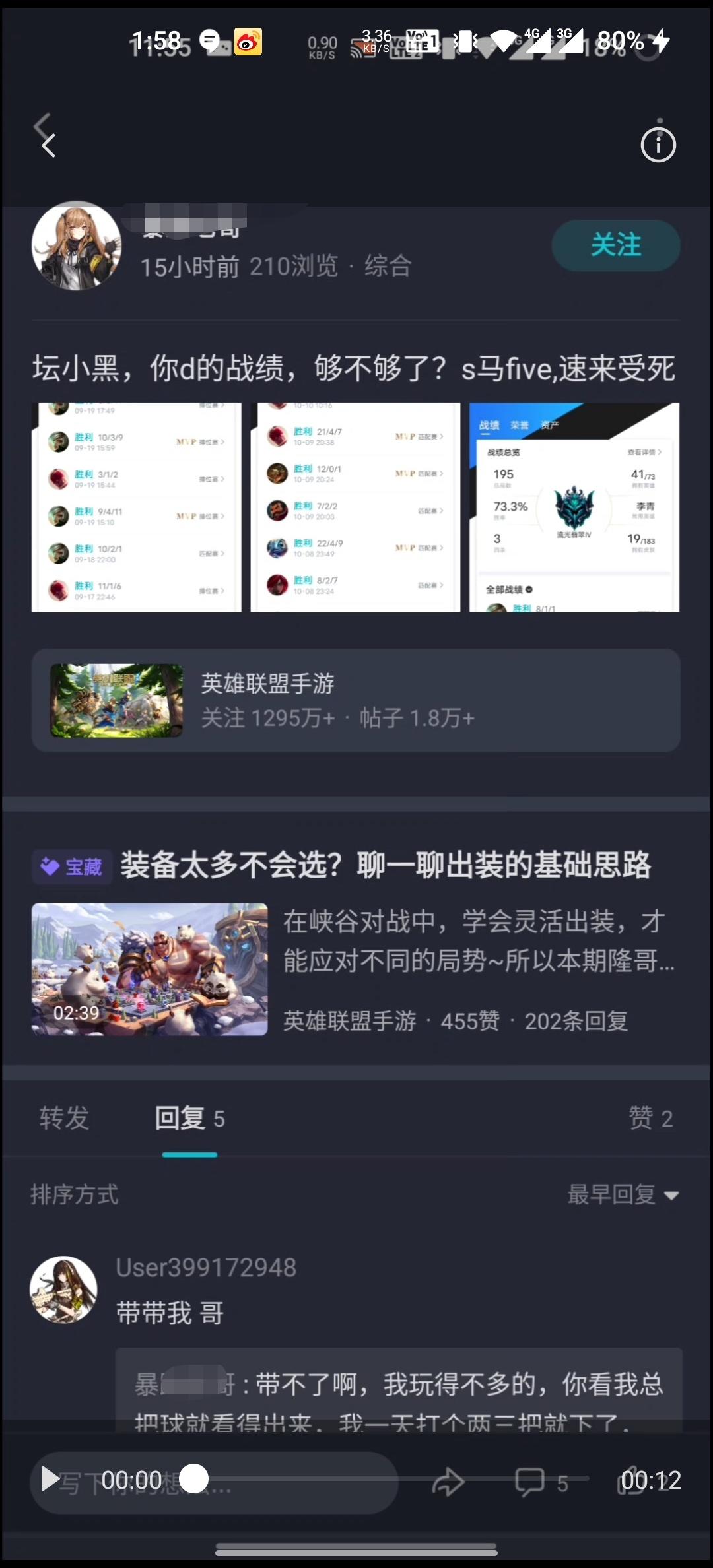 这是我之前捉到的,事情的起因是这位老哥在其它吐槽匹配机制的帖子下面洗地,叫“坛小黑”的同学就跟他杠上了,让这位老哥晒战绩,结果这位老哥真发帖晒战绩了(就是下面三张战绩截图),并@坛小黑,对其进行羞辱,但仔细看战绩图可以说漏洞百出,,,也不是说水军不好或者怎么样,他们也不愿意洗地,,,作为打工人咱就说给老板打工能不能细点心,你这样不是越描越黑么,谁家养咬主人的狗呢?