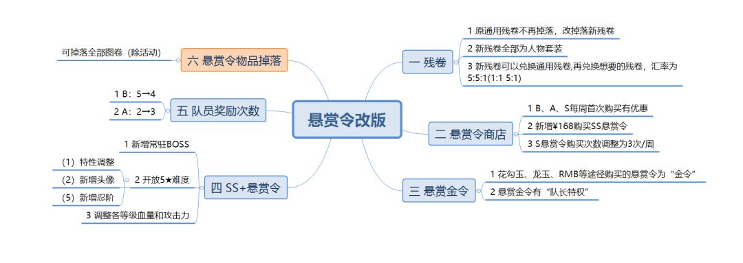 一、 11.4日更新中,游戏基础板块“悬赏令”进行了一次重大调整,应该说是到目前为止力度和意义最大的一次,调整内容在这https://www.taptap.com/topic/19566876,内容有点长,我概括了一下,见下图