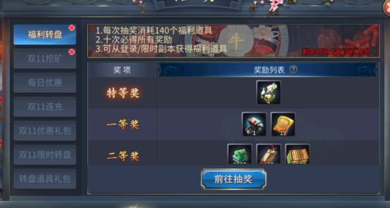 5、双十一限时转盘活动开启,活动时间11月7日至11月12日。每次抽奖消耗不同数量的抽奖道具,将有机会获得神铁贴、稀*水镜令、神器碎片、“乐”字等道具,奖励丰厚,快来抽取。