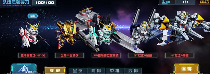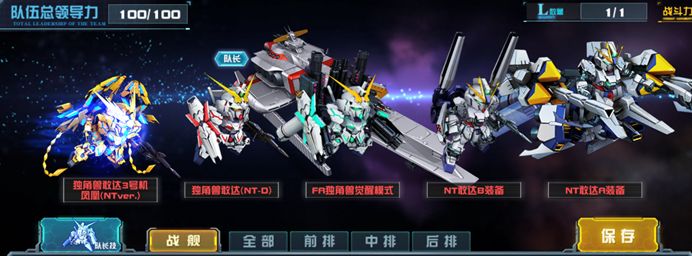 推荐理由:这是一支正统的UC队,队长技独角兽敢达(NT-D)和大型机NT敢达A装备的地位不可动摇,NT敢达B装备搭配FA独角兽觉醒模式出场,报丧女妖·命运女神(觉醒)使整个队伍的攻防更加平衡。