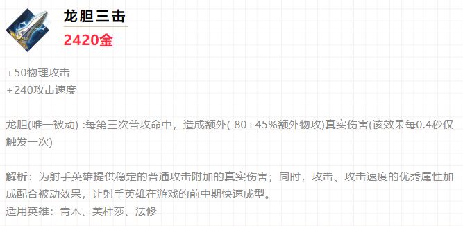 这件装备有着高额的物攻和增伤被动,但射手一般都走暴击攻速流,再加上昂贵的价格,对射手来说属实性价比不高。对黄忠、帕提多来说可以作为常规出装,对其他射手,后期经济溢出可以考虑用它换掉一件装备