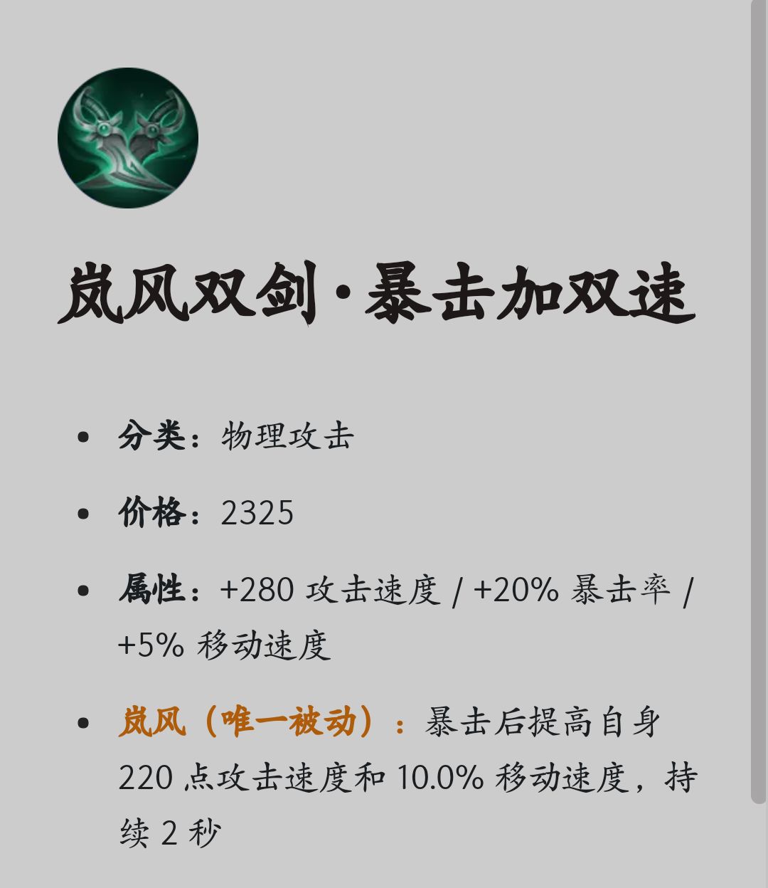 回想上版本,闪电之刃8%的常驻移速,岚风双剑5%的常驻移速加暴击的10%移速。虽然追不上那些能翻墙的战士刺客,但好歹有一定自保能力
