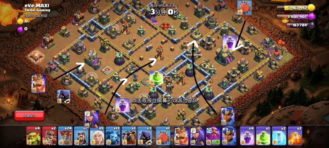 我个人觉得这个路线图已经很清晰了,男王爆天鹰,女王打掉投石炮在弹跳进中圈,飞艇狂暴保本,闰土从下面慢慢清。剩下的大部队狗球随便打了。