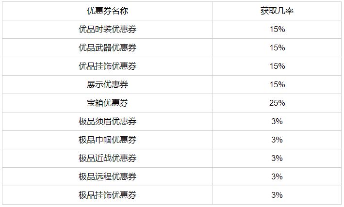 在【沙场秋点兵】活动中兑换获得【优惠券幸运宝箱】,打开优惠券幸运宝箱,随机获得以下优惠券: