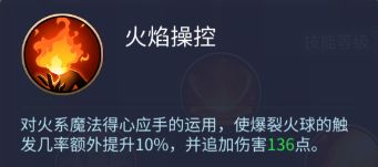 火焰操控:对火系魔法得心应手的运用,使爆裂火球的触发几率额外提升10%,并追加伤害136点。