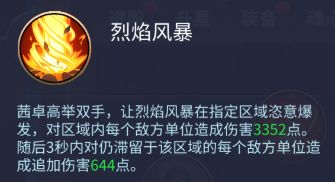 烈焰风暴:茜卓高举双手,让烈焰风暴在指定区域恣意爆发,对区域内每个敌方单位造成伤害3352点。