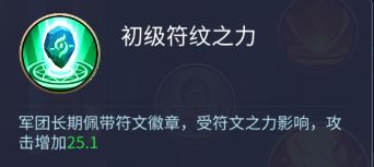 初级符文之力:军团长期佩戴符文徽章,受符文之力影响,攻击增加25.1