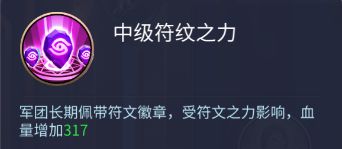 中级符文之力:军团长期佩戴符文徽章,受符文之力影响,血量增加317