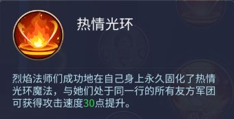 热情光环:烈焰法师们成功地在自己身上永久固化了热情光环魔法,与她们处于同一行的所有友方军团可获得攻击速度30点提升。