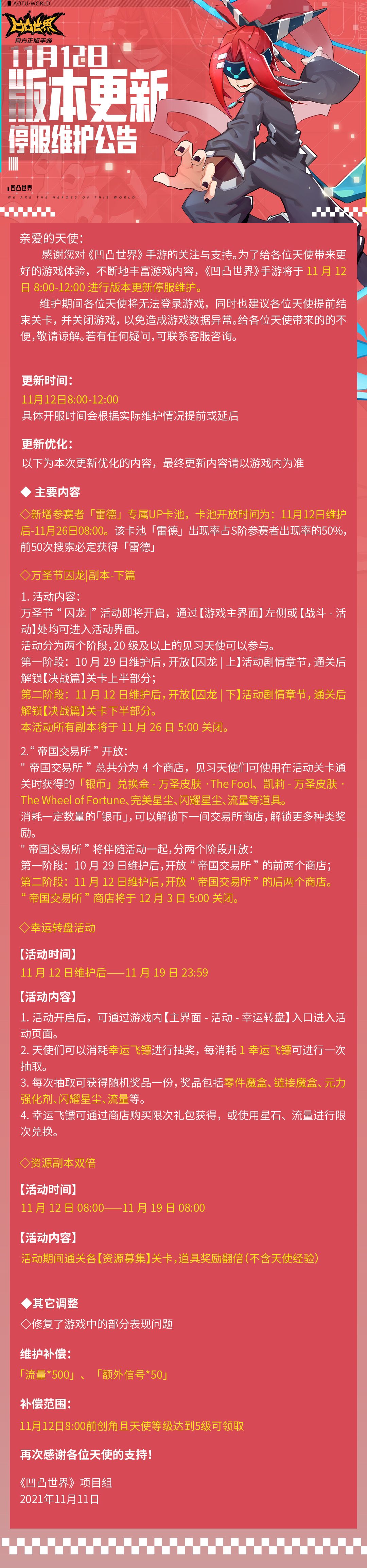 感谢您对《凹凸世界》手游的关注与支持。为了给各位天使带来更好的游戏体验,不断地丰富游戏内容,《凹凸世界》手游将于11月12日8:00-12:00进行版本更新停服维护。