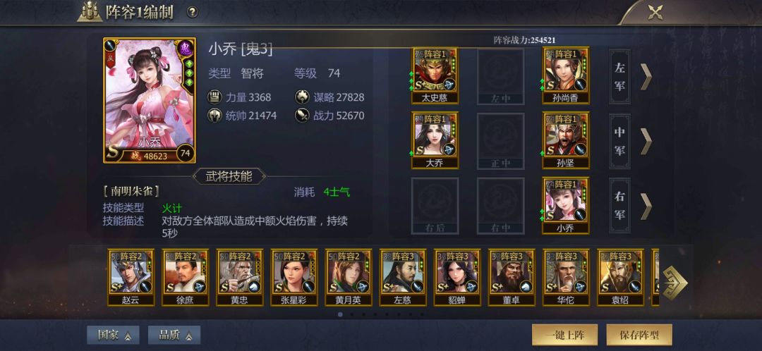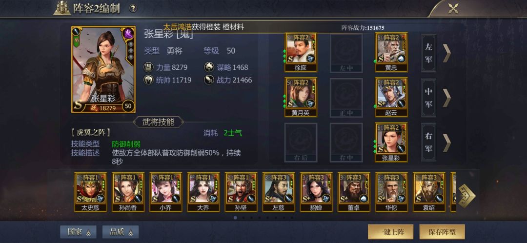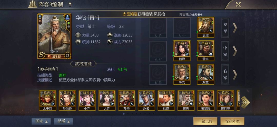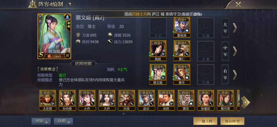 ,群雄队是后期平民玩家的首选阵容,无需V12武将作为核心输出,甚至加势力武将伤害的董卓,连V武将都不是,相比其他势力V10武将可谓亲民,以左慈为核心群体伤害不俗,遇上能清除负面效果的郭嘉就将袁绍换成张角,有条件可换成吕布,亦可一战。3堪势在这里就没什么好说的了,就是武将的站位需要根据敌方的站位来调整,打副本的话就会深有体会