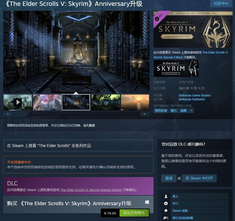 《上古卷轴5:周年纪念版》Steam现已上线 升级包售价79元