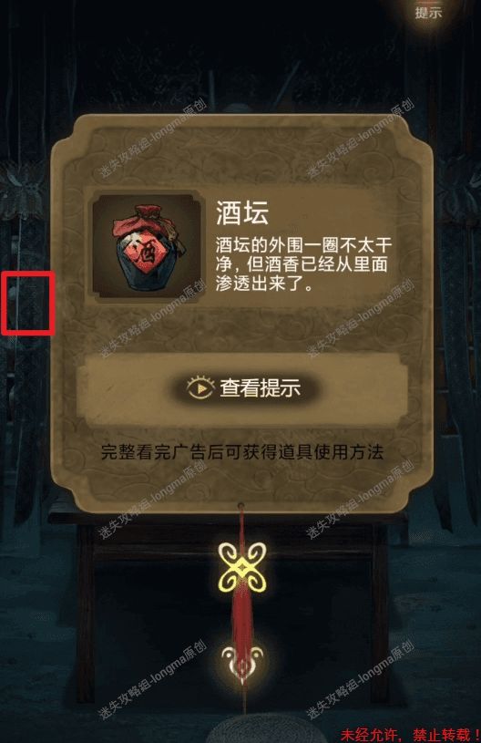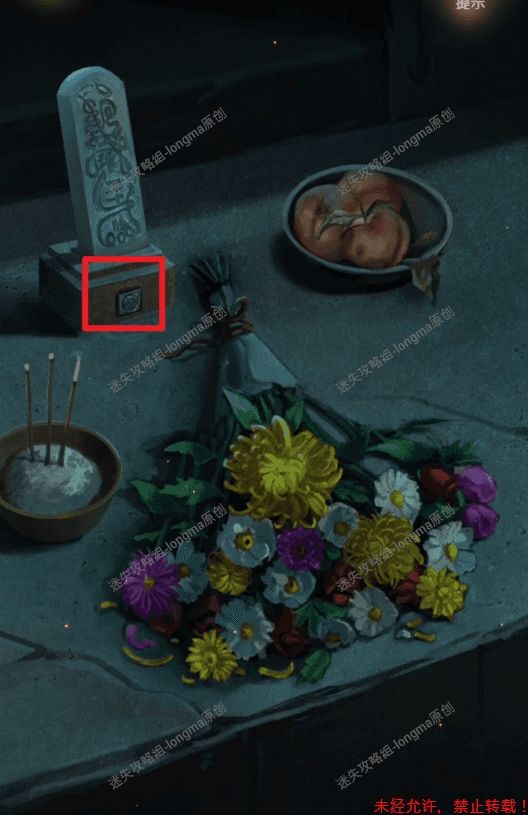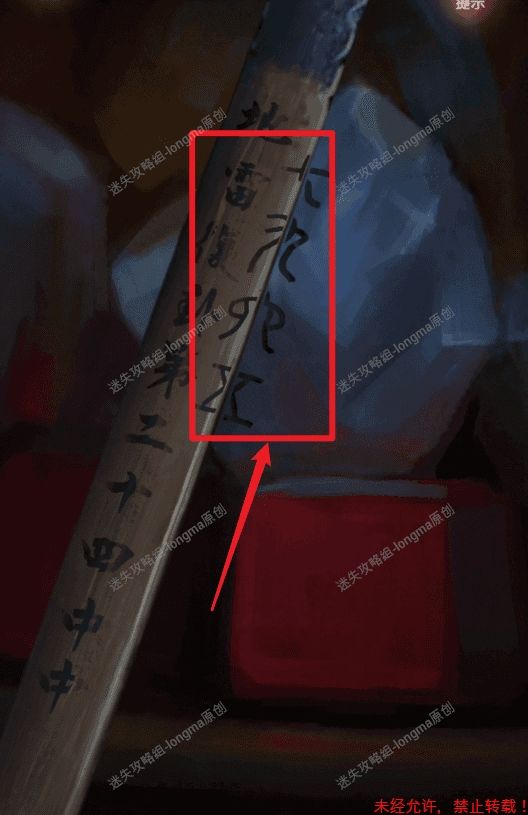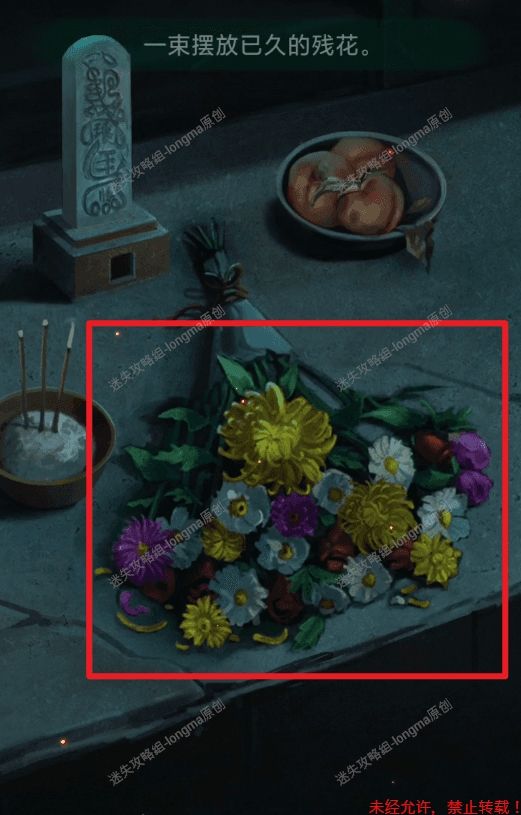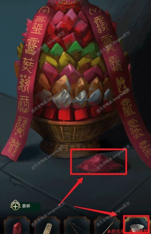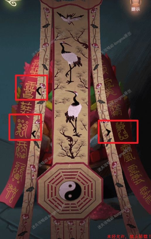 64.进入前院屋子,点击花篮,使用幡面,找到线索(幡面有三个箭头样的花纹,箭头指向花篮上的符文就是线索)。64