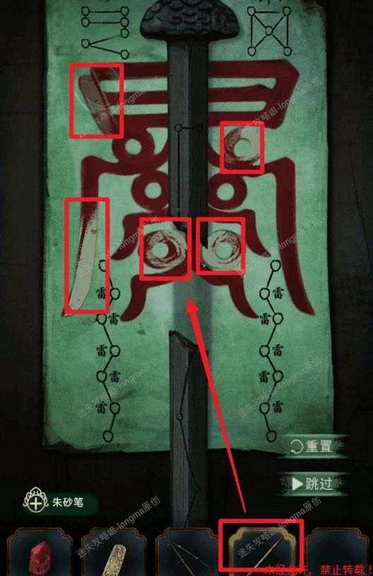 59.进入前院房子,将断剑剑身和断剑剑柄放在桌子上的符纸上,使用朱砂笔将符文完成,得到木剑。59