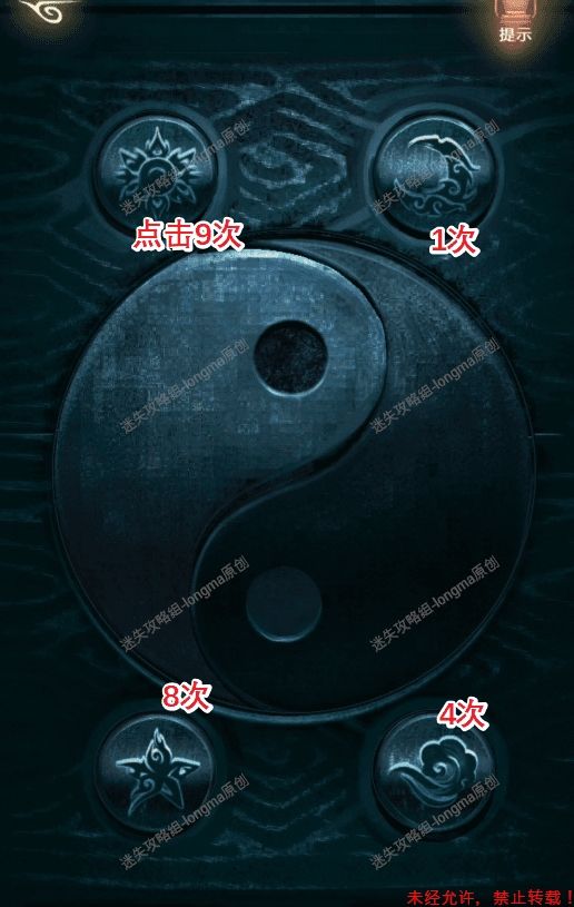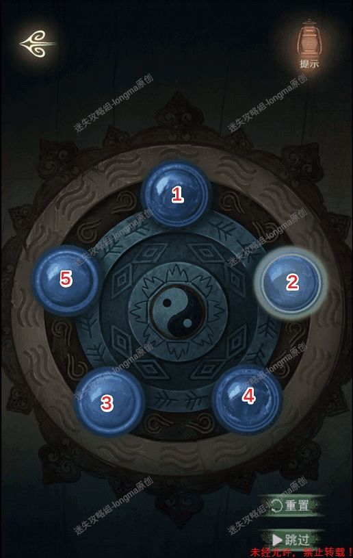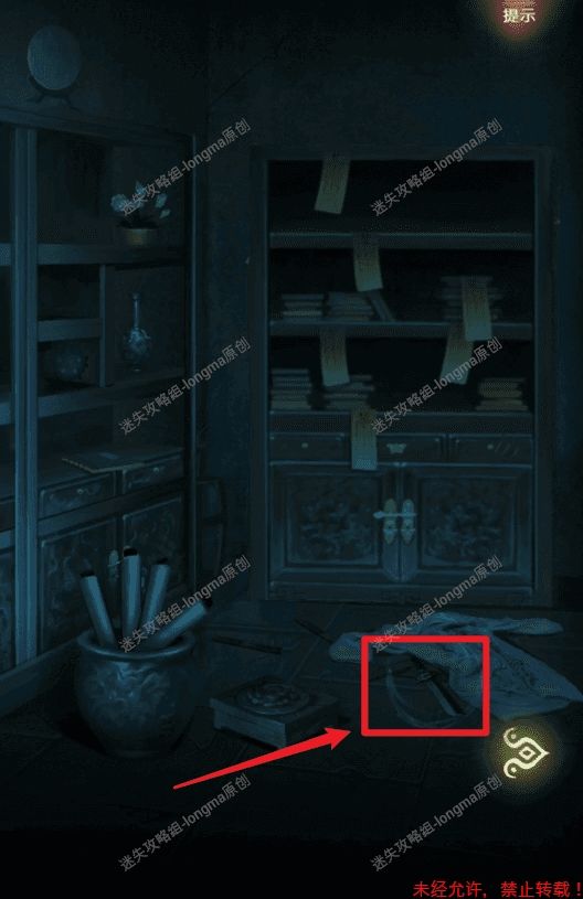 60.点击上方的灯笼,从灯笼下的八卦图案中得到线索,进入里屋,点击左边书架上的机关,依次点击五个圆球,打开密室。60 60.1