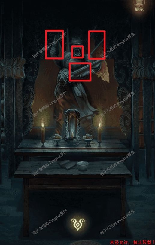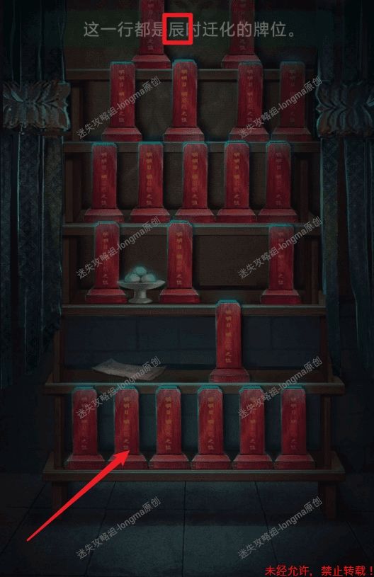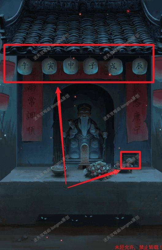 39.点击神像右侧,看到牌位,从上往下依次点击每行牌位,根据每行牌位的提示,得到密码:午寅申子戌辰。39