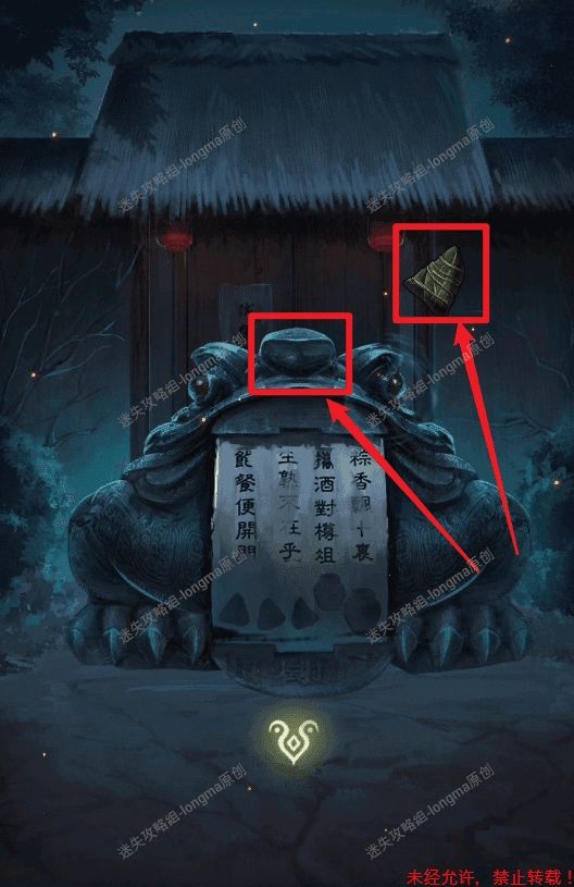 41.来到大蛤蟆处,点击大蛤蟆头顶,将两坛酒和三个粽子喂给大蛤蟆,打开房子大门。41