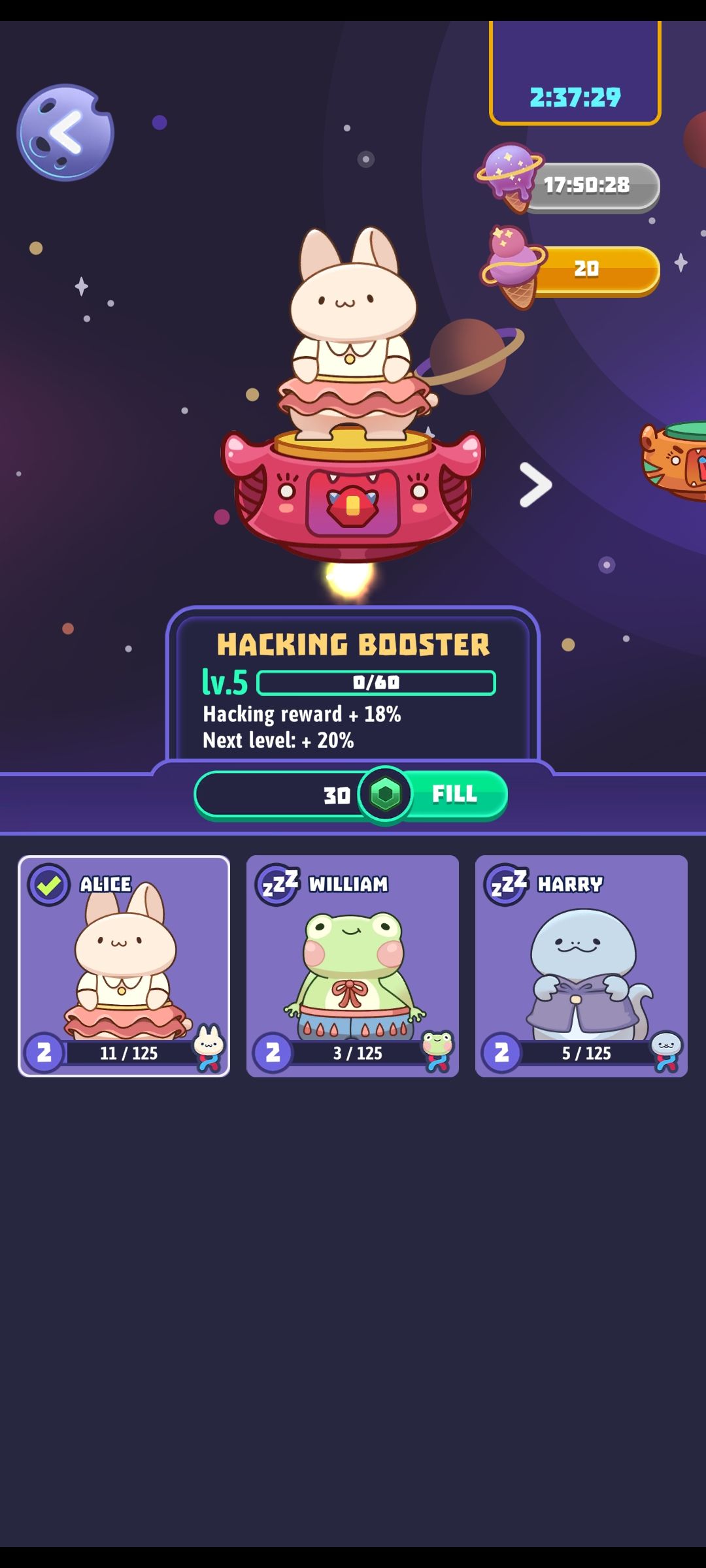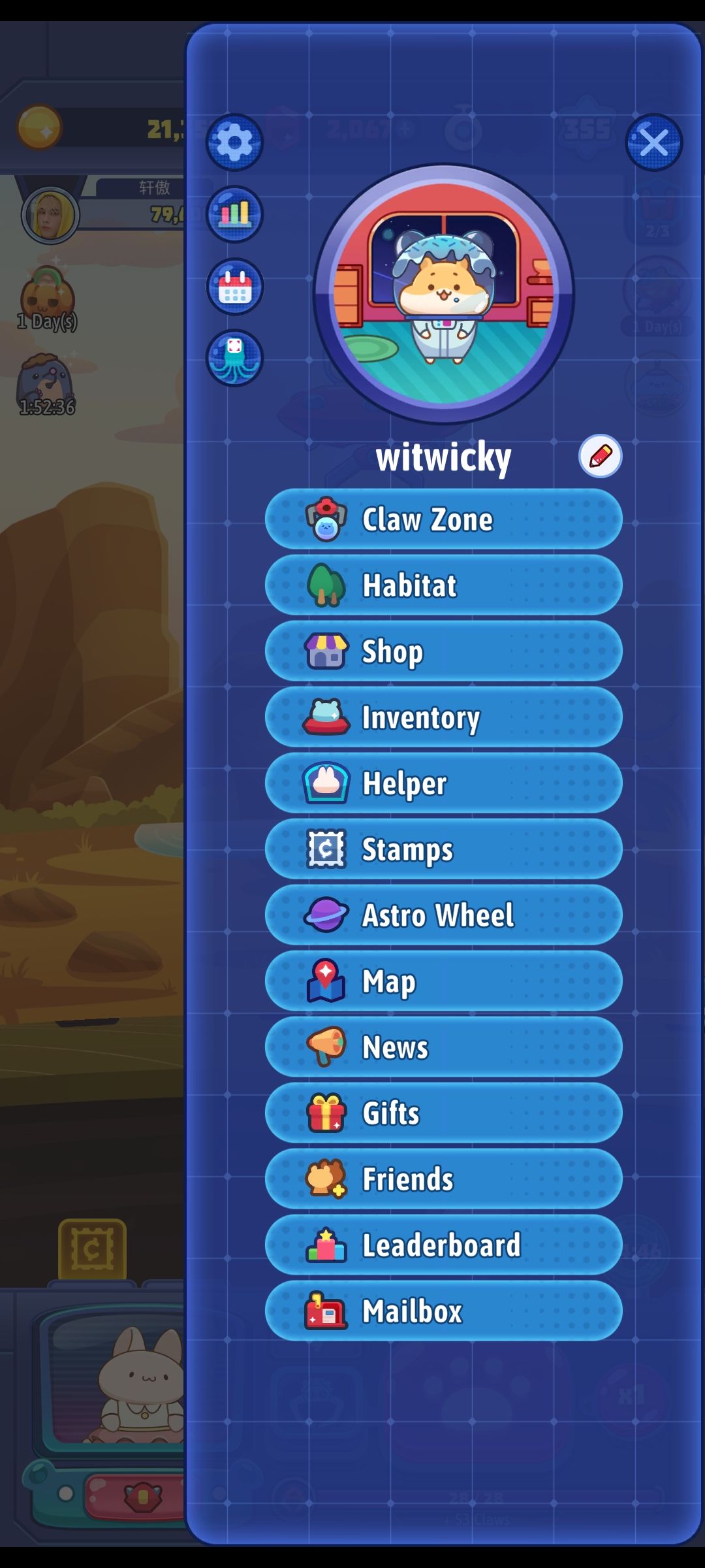 再往下是装束。可以看到我的主角是带着一个中二头盔的哈哈哈,通过打开高级扭蛋可以概率获得兑换券(部分活动也可以获得),每5张兑换券or宝石*100就可以抽一次主题装扮(目前有三种免费主题装束和一种氪金限定主题装束) 。装束包括主角的宇航服头盔、抓娃娃机的摇杆和主角的飞船。抽到重复的装束可以用来升级已有装束(变得更加华丽丽一点点)所以这真的也是个换装游戏呀🌝 第五个helper也就是上面提到的兔子,这个设定纯粹就是相当于卡牌游戏里的废卡,拖延游戏进度,个人觉得很鸡肋很失败。终于到了第六个,邮票。这是本作最最核心的也是国外嗨皮国内难过的社交属性!邮票玩法在到达第二个星球的时候开启,此后每到达一个新星球都可以获得4张邮票。其他获得途径目前只有商店金币购买(这个有毒,因为你越往后玩,价格越高) 和限时活动完成任务。所有获得的都是邮票盒子,没错,测试人品的时候到了!提前声明,这个游戏的爆率非常离谱,我已经到了第10个星球,直接一个邮票本还没集全,11/12种,重复最多的一种已经有了10张🌚在如此离谱的爆率下想要收集全,只能寄希望于邮票交换!可惜楼主没能测试这个无比期待的功能(游客流下了羡慕的泪水)!脸书玩家可以把自己多余的邮票通过社交系统赠送给其他人,帮助他人完成收集梦想~但还是要回到轻社交的本质——“轻”上,因为我想不通集全之后这个社交系统还有啥子用🙄其他的社交性比如可以绑票别人的动物换金币(注意❗不是占为己有,而是直接获得金币),黑入他人的金库偷钱,封锁对方的星球建筑以及给别人的扭蛋机里面投入石头等等,这些都不算重点,就不一一赘述啦。再往下是一个转盘,也是在扭蛋里概率获得转盘票,一张转一次,内容就是些宝石金币,转到一定次数10/20/30分别有不同的奖励(还算丰厚)。第八个是地图,可以查看当前所在的星球。第九个是你和他人的互动消息。最后的几个基本不咋用 。