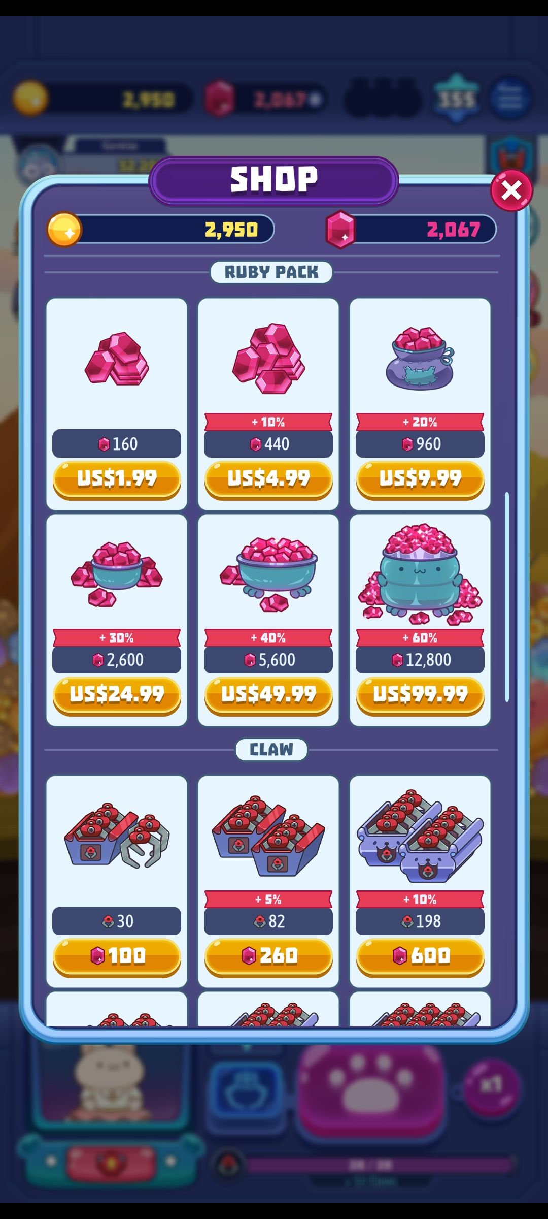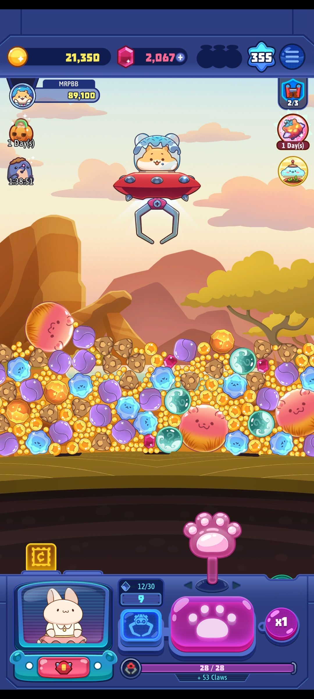 正如我一开始说的那样,这是个重单机轻社交游戏,目前测试阶段只提供facebook(Meta?)账号登录,也可以绑定诸如reddit等等。在菜单页面,第一行就是抓娃娃区,第二行是你收集来的小可爱们的栖息地(大雾!我感觉就像是抓来的!有些地图比如火山,那些小可爱就孤零零地站在岩浆里的石块上,这也太遭罪了!) 第三行是商店,目前金币只能购买邮票(下面介绍) ;宝石可以兑换的物品不少,但是不推荐;氪金见仁见智,我的看法是非活动期不氪金~氪金话题点到为止。