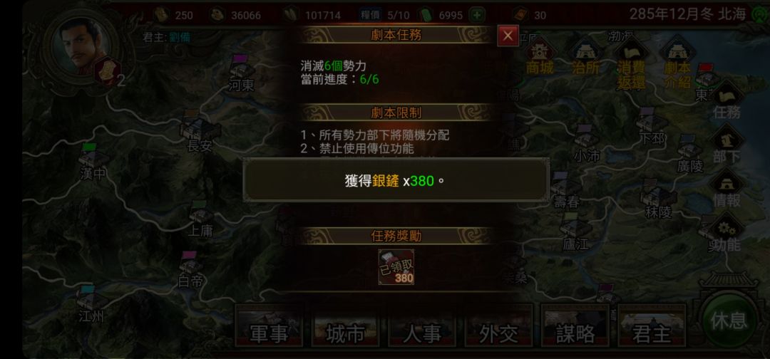 開局把2個自創角升做軍師(可帶2萬人)再來募兵,訓練一次,直接開打(不用搞研發,內政,民忠)