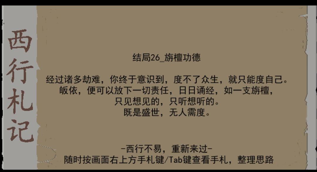 目前已完成视频攻略,17章选择【皈依】达成【结局26旃檀功德】,选择【不皈依】达成【结局27紧箍咒】。