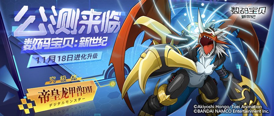 由东映动画正版授权,万代南梦宫(上海)娱乐有限公司联合奇侠互娱共同开发的《数码宝贝:新世纪》,将于11月18日开启公测!届时诸多新增数码宝贝强势来袭,数码宝贝图鉴更新多条进化路线,全新时装与莱恩岛太空皮肤也将惊艳登场!