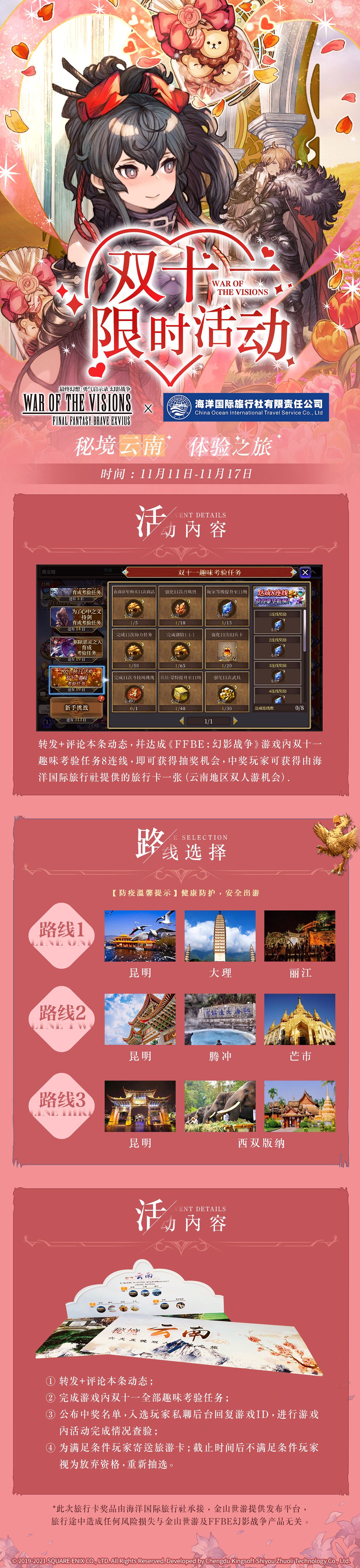 1、玩家需于11月18日前,完成FFBE幻影战争国服游戏内【双十一趣味考验任务8连线】,并将截图和游戏内ID发送到本帖下