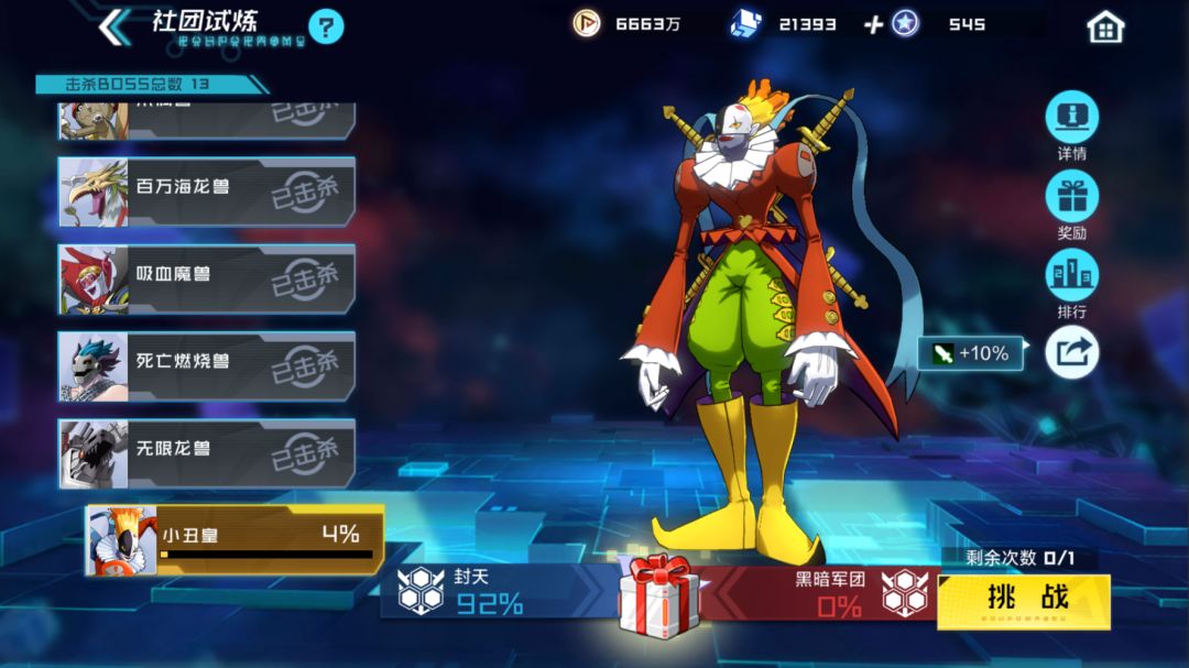 接着社团试炼这个打boss的玩法大家可以点击boss右上角的详情看看,其中会介绍boss的特点和能克制他的数码宝贝,另外点击分享按钮还可以增伤10%,打之前大家千万不要忘了!