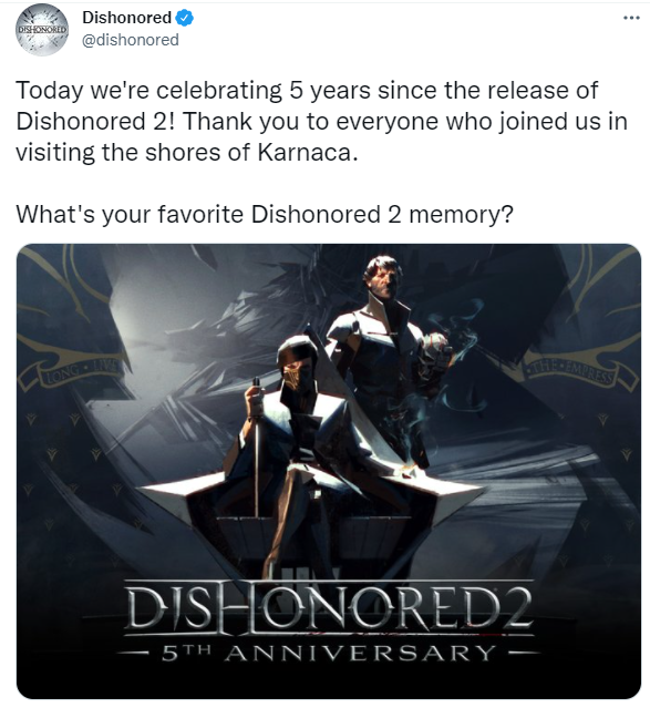 开发商Arkane Studios在推文中表示,今天是《耻辱2》发售五周年,我们为此庆祝,感谢所有支持过这款游戏的玩家。那么各位对这款游戏印象最深的是哪一段呢?