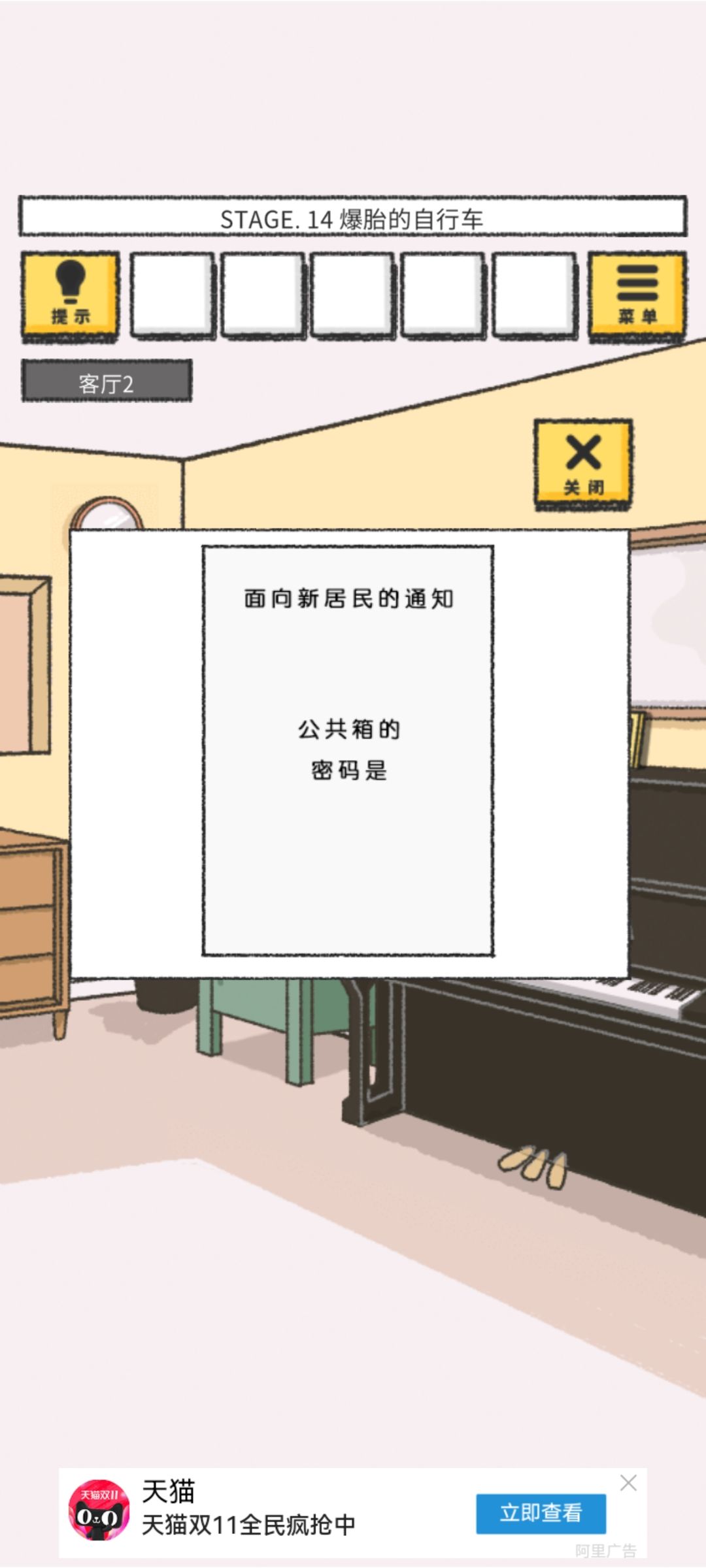1、广告实在太多了。我懂回忆和提示需要看广告,但是!!!这个提示一真的没必要出现,我后面卡关想点提示的那一刻都能想到提示一会给什么内容了,真的是太悔体验了,另外还有个bug,自行车爆胎那关那底下不用找铅笔抹黑了看密码,他只是个bug,隐藏了“share”![[嗒啦啦2_哈哈]](https://img-tc.tapimg.com/market/images/1bbca193685a619674d8260ad0ed7455.gif)