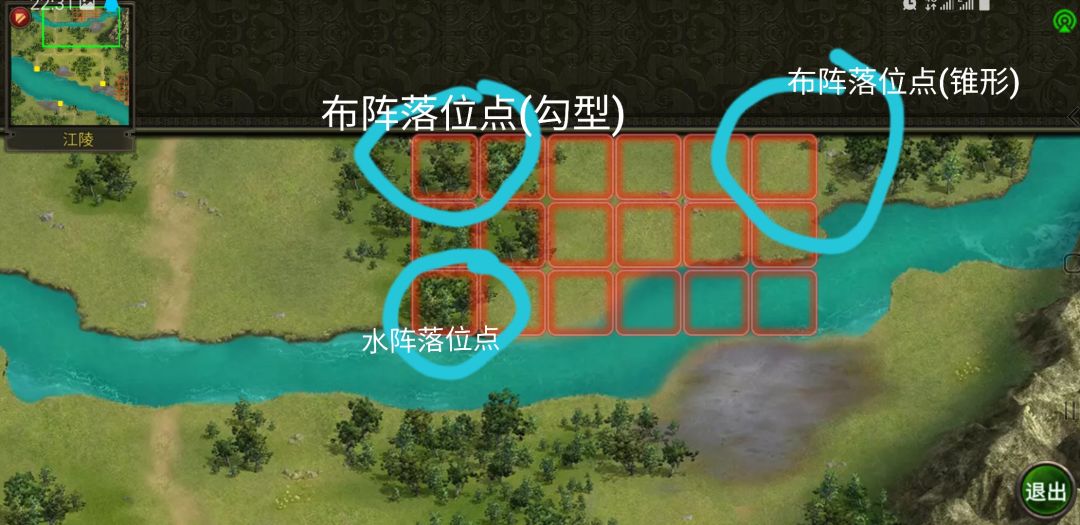 ①带勾型阵的武将水阵落位,落位1回合开疾行顺水左行,走完以后变勾型,第2回合开疾行顺山往下,走完变水阵(如果左中城有武将能打到你,优先保证往中间河流的路的通畅,其次尽量规避伤害),如果快入河的时候下面的守城军队还没有完全过河,可以在地上或者河的左上角等一回合,尽量让守城军过河(如果被敌人追上就不考虑过河的问题了,尽量规避伤害),