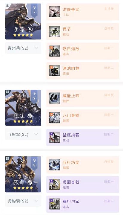 五子骑阵容与技能较多变,但都是以张辽为基础构建的爆头队伍,通过八门金锁的缚足效果,能让双核更快攻击到敌方后排武将,主公根据个人情况对连击技能进行替换即可,尽量保证怒目+酒池存在。